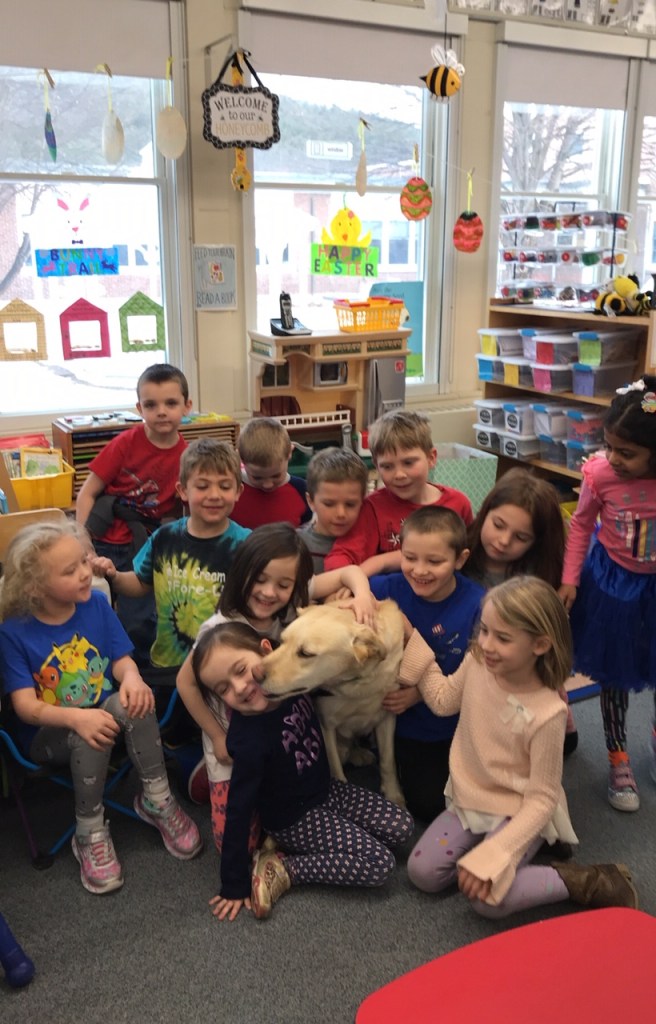 Dasher does about 30 hours a month in several Upper Valley Schools. We visit with children and adolescents privately, in classrooms, and on the playground. His effect on the students and teachers is dramatic. He has helped with children who have learning disabilities, e.g., children with dyslexia will read to him despite their anxiety. He works with students who are autistic by taking his leash and feeling comfortable enough to walk through sensory overwhelming environments (e.g., crowded, noisy hallways). He also is essential for some students who have major mood disorders. Their time with him ranges from just intimate contact (he is a non-stop licker) to using him to learn about training a dog as they aspire to be a dog handler or veterinarian.