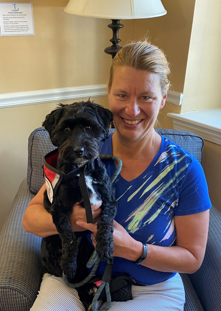 Zoe and I were visiting the residents at Sunapee Cove one day and having a nice time. I noticed a man in his mid 50’s enter the room with his walker and sit in the far corner. He was looking over at the dogs and the resident’s who were visiting. I felt like he wanted to engage with the group and the dogs but was hesitant. Zoe and I walked over and sat beside him, asking if he would like to visit with my pup. He immediately said “Yes” and then we had a lovely chat about his prior dogs. It was lovely to see his face light up and hear his stories. I know that Zoe comforted him, however for myself I left Sunapee Cove that day feeling the real therapy was a gift to myself, seeing someone’s day be a little brighter with the wag of a tail!